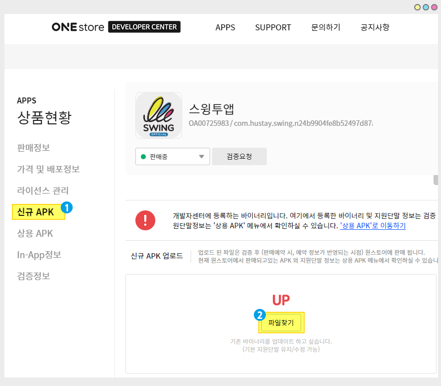 2) 신규 APK 업로드 (기존 바이너리 업데이트) 항목에서 [파일찾기] 버튼 선택