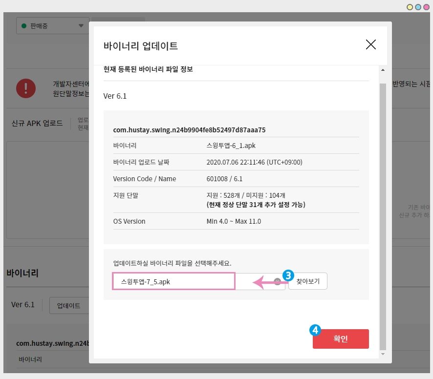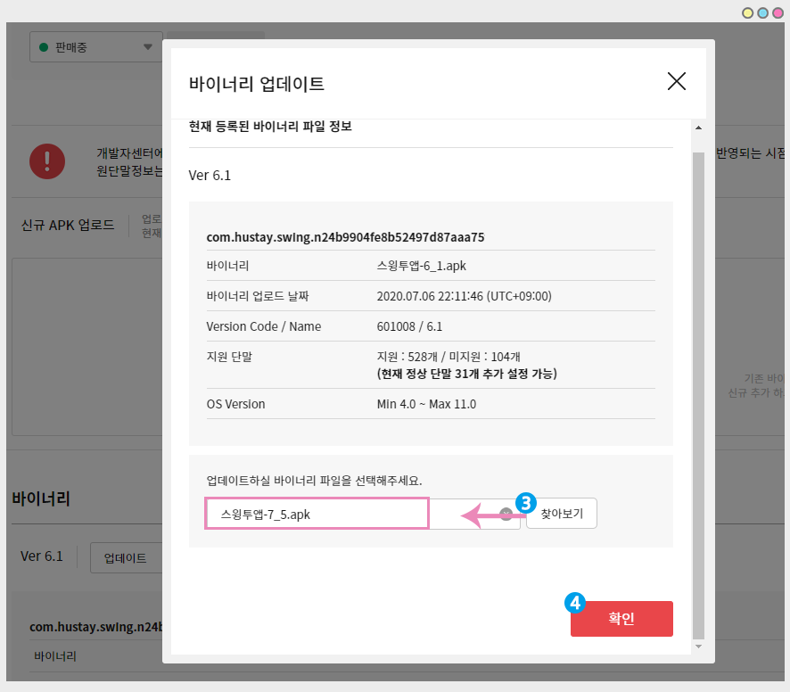 3) [찾아보기] 버튼을 선택해서 새로 업데이트 할 APK파일을 등록해주세요.
