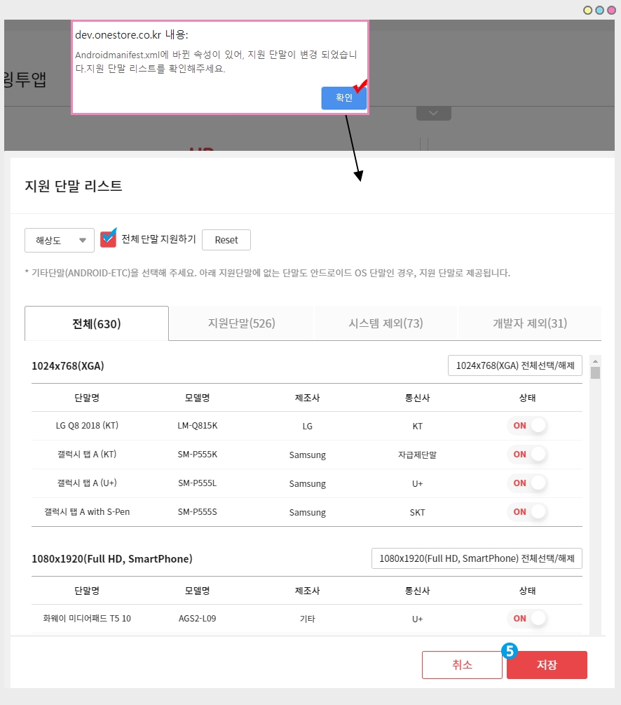 5) APK파일을 첨부하면, 원스토어에서 지원하는 지원 단말 리스트 창을 띄어줍니다.