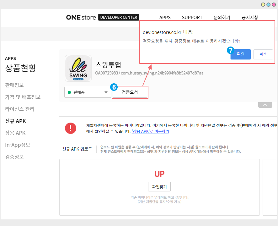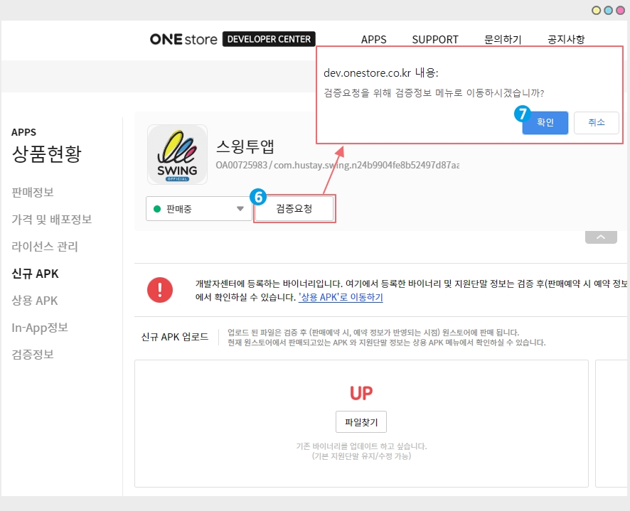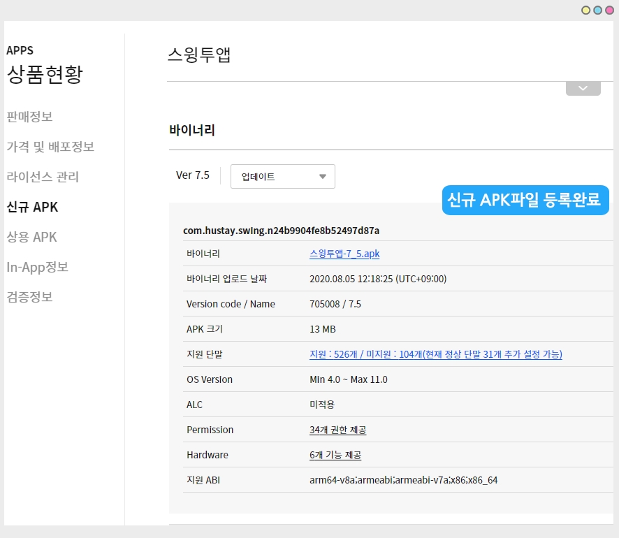 이렇게 하면 신규 APK파일 등록이 완료됩니다. 이어서 해당 APK파일 검증 요청을 진행할게요!