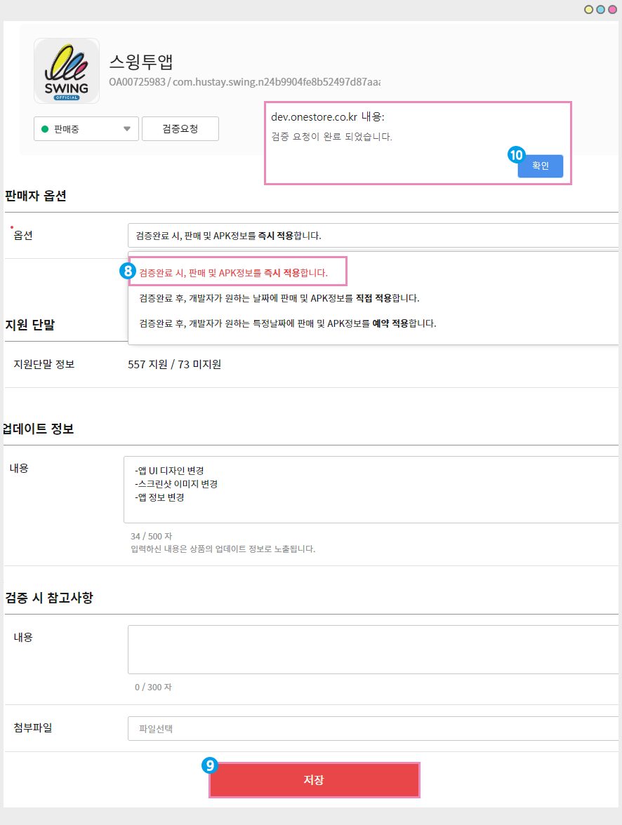 8) 옵션바를 선택해서 “검증 완료시, 판매 및 APK정보를 즉시 적용합니다”에 체크해주세요.