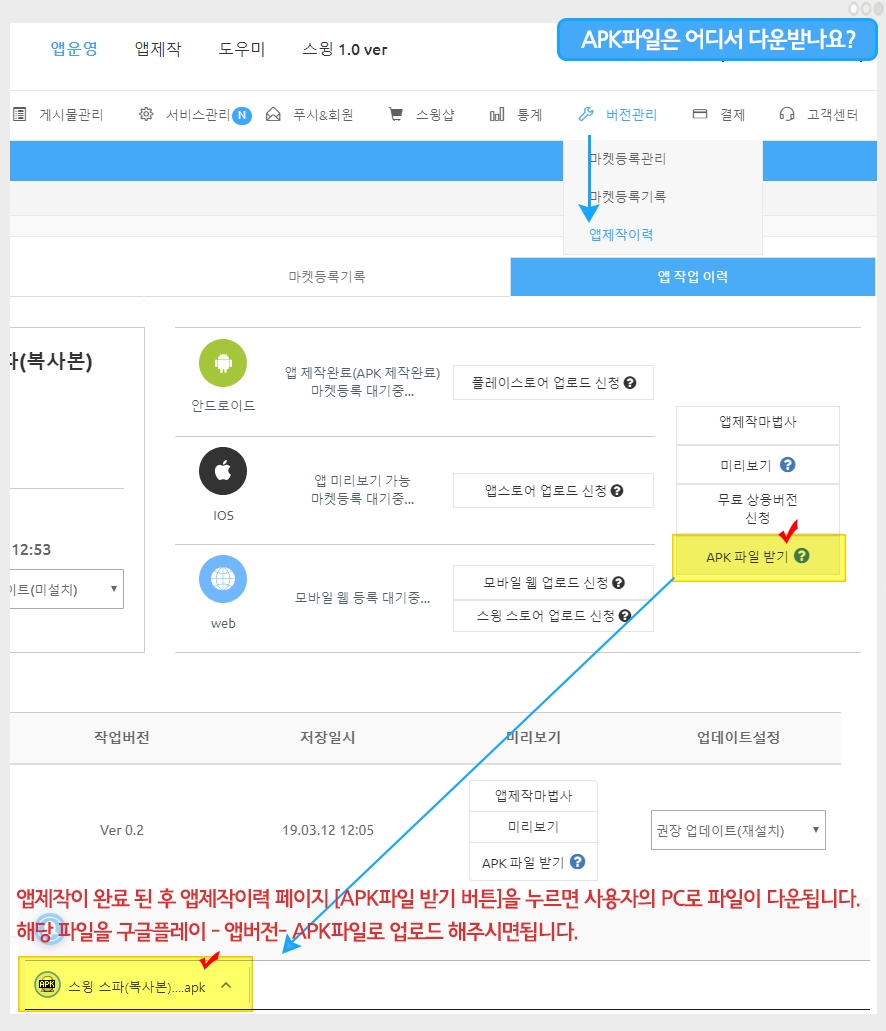 APK파일은 스윙투앱 홈페이지 → 앱운영 페이지 →버전관리 → 앱제작 이력 페이지에서 [APK파일 받기]를 통해서 가져올 수 있어요.