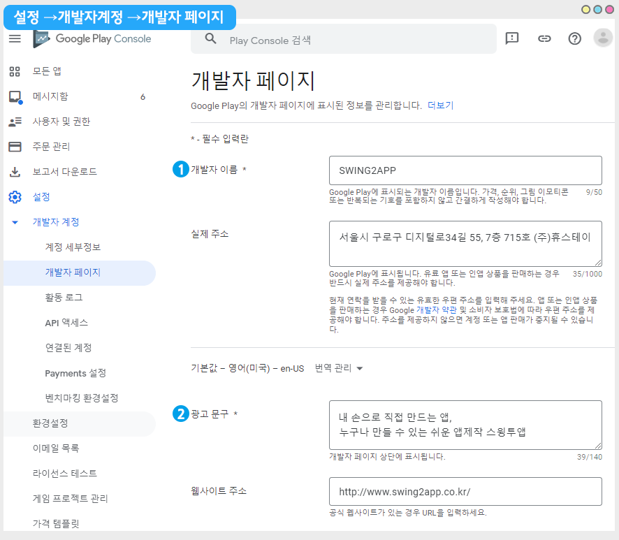 3) 2020년 11월 2일부터 변경된 구글 정책에 따라 개발자 이름을 변경하는 경우 개발자 페이지 내용을 등록해야 이름 변경이 가능합니다.