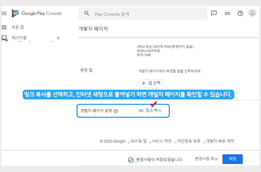 개발자 페이지 공유 항목에서 [링크 복사] 버튼을 선택하면 개발자 페이지 링크주소(URL)가 복사되구요.