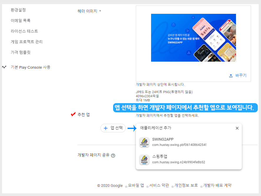 4)헤더 이미지 등록 : 개발자 페이지 상단에 표시되는 이미지입니다. 사이즈: 4096px(가로)*2304px(세로)