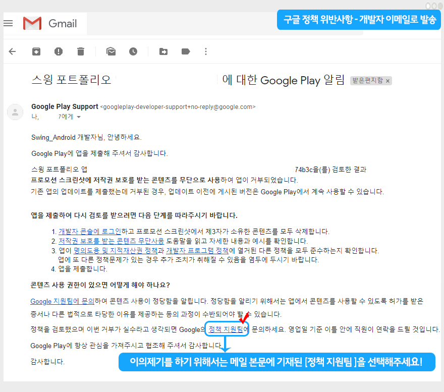 그리고 내가 제작한 앱이 정책상 아무 문제가 없는데 심사가 거절되거나, 앱이 삭제된 경우는! 구글팀에 이의 제기하여 앱을 복원받을 수 있습니다.