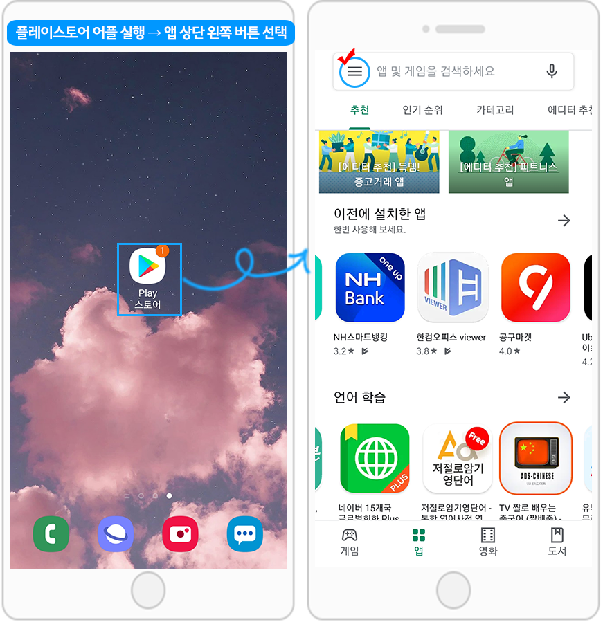 2) 플레이스토어 앱 화면 상단 왼쪽의 목록 버튼 선택