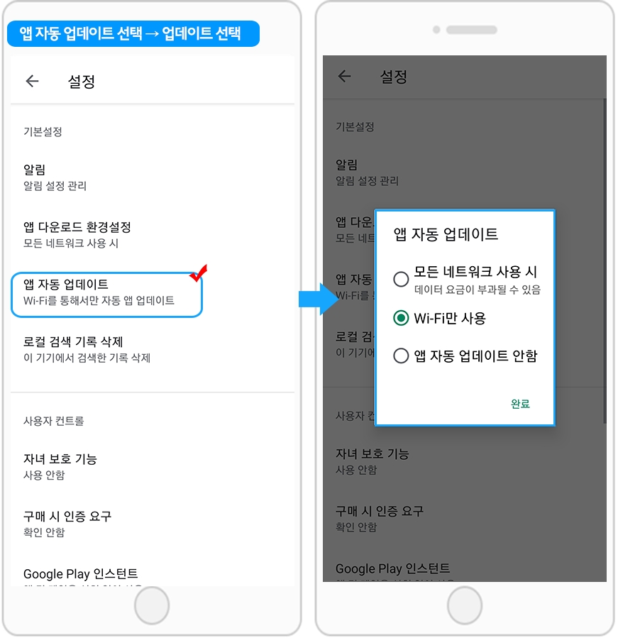 *일반적으로 업데이트 설정은 Wi-Fi만 사용으로 셋팅되어 있구요.