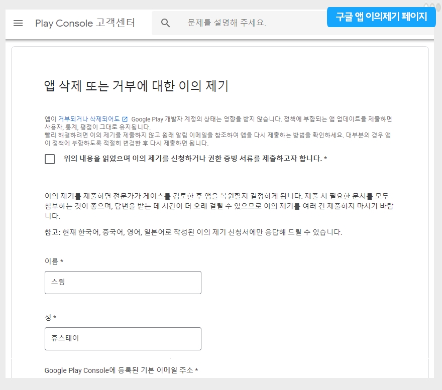 앱 삭제 또는 거부에 대한 이의제기 페이지로 이동하는데요.