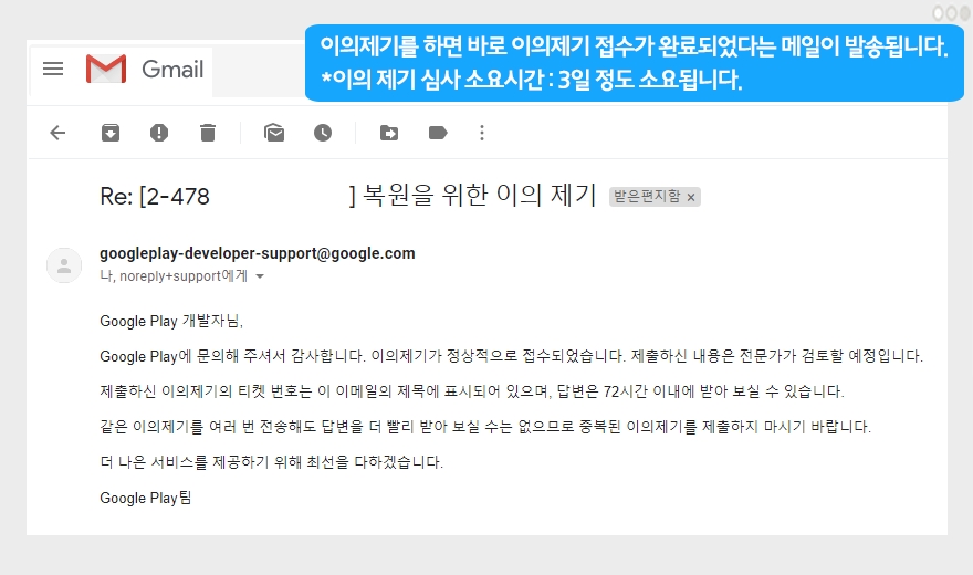 구글에서 이의제기가 정상적으로 접수되었으며, 심사는 72시간(3일)이내에 결과를 받아볼 수 있다고 기재되어 있습니다.