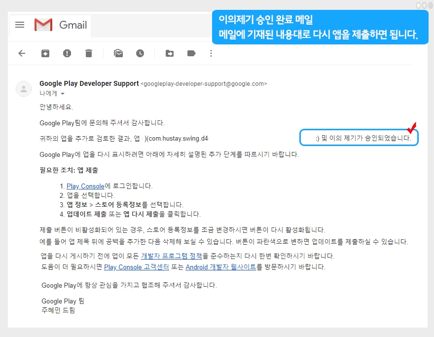 승인완료 메일에는 구글플레이스토어에 앱을 다시 출시하는 방법에 대해서 제시하고 있어요.