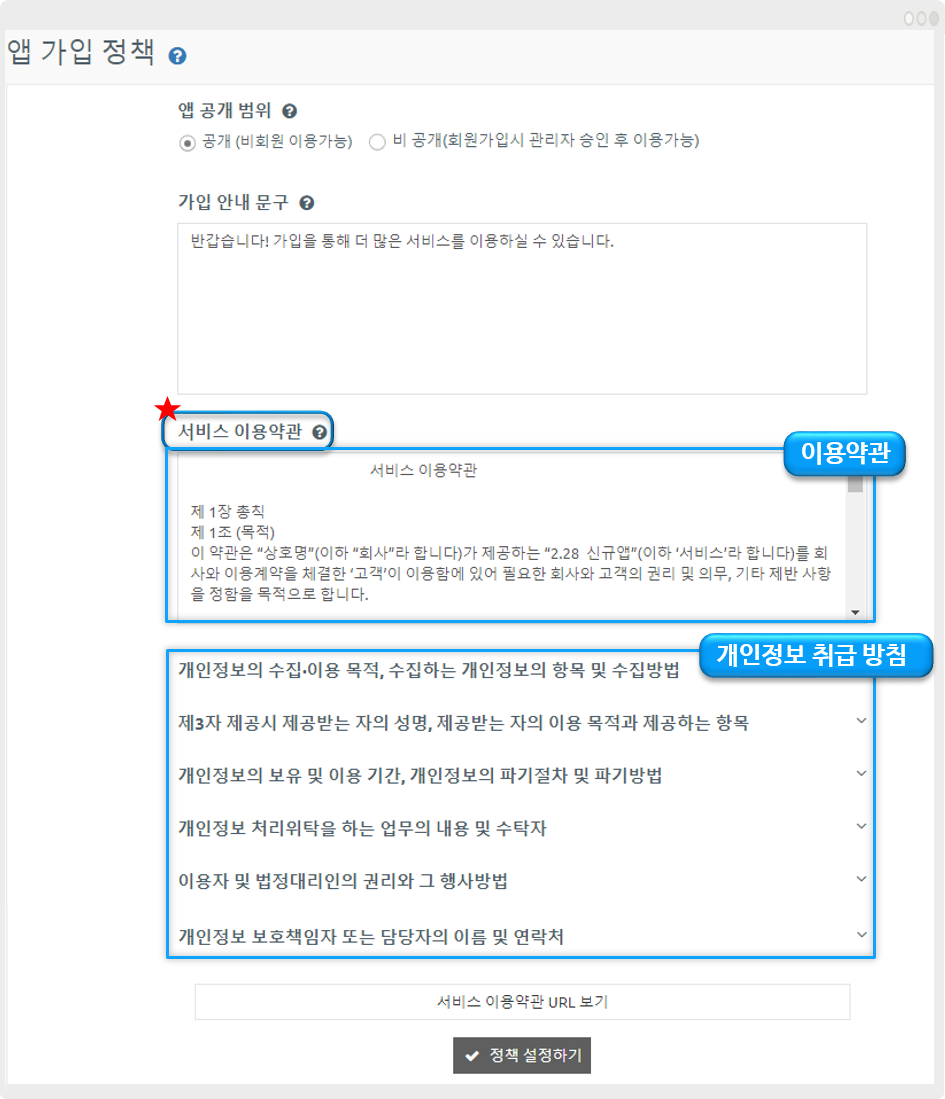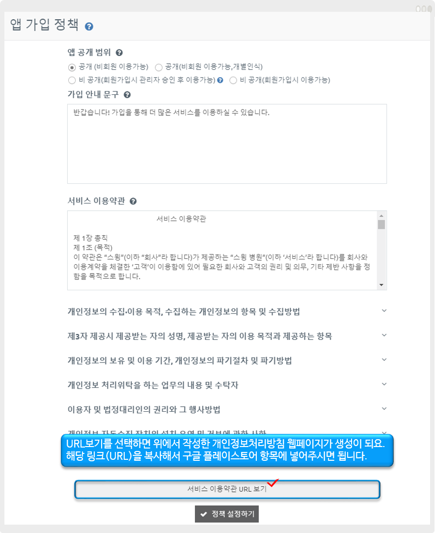 해당 약관을 앞서 설명한 개인정보 처리방침 URL로 적용할 수 있습니다.