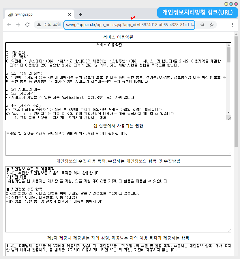 (해당 이미지는 스윙투앱 사이트의 개인정책취급방침 페이지에요!)