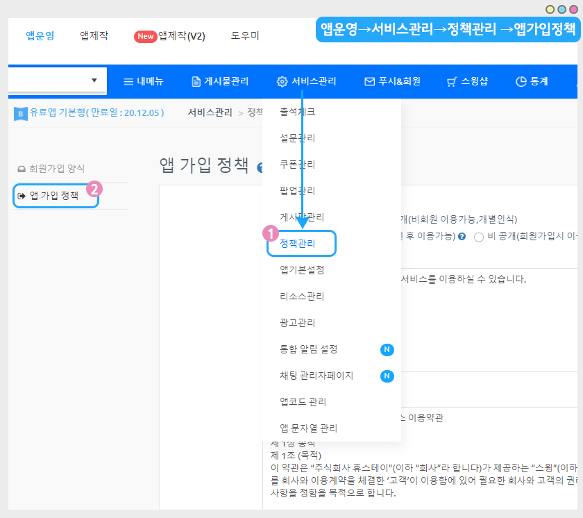 스윙 앱운영 페이지 →서비스관리 →정책관리 →앱 가입 정책 페이지로 이동합니다.
