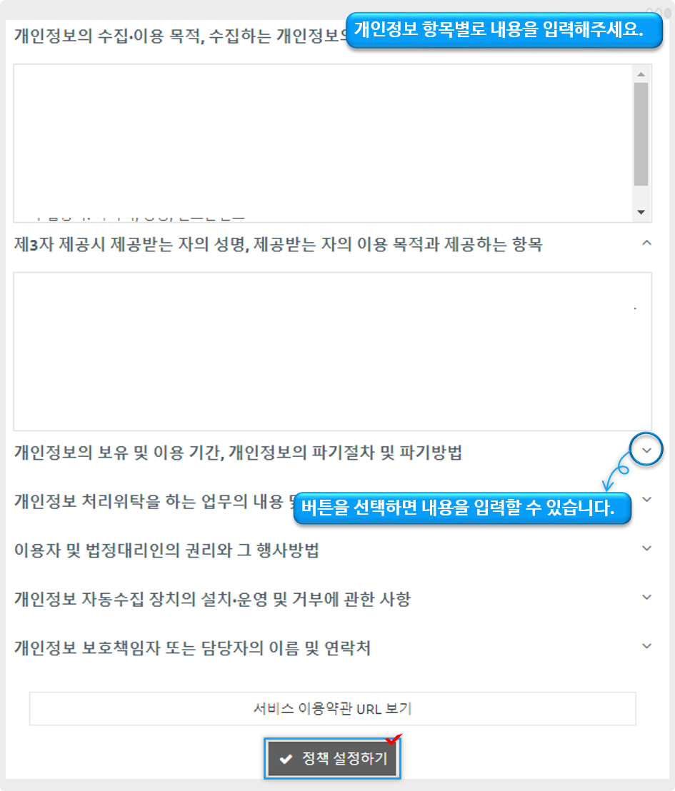 *이용약관, 개인정보 처리방칙 내용 입력 및 수정이 모두 완료 되면 하단에 [정책 설정하기]버튼을 선택해서 저장해주세요.