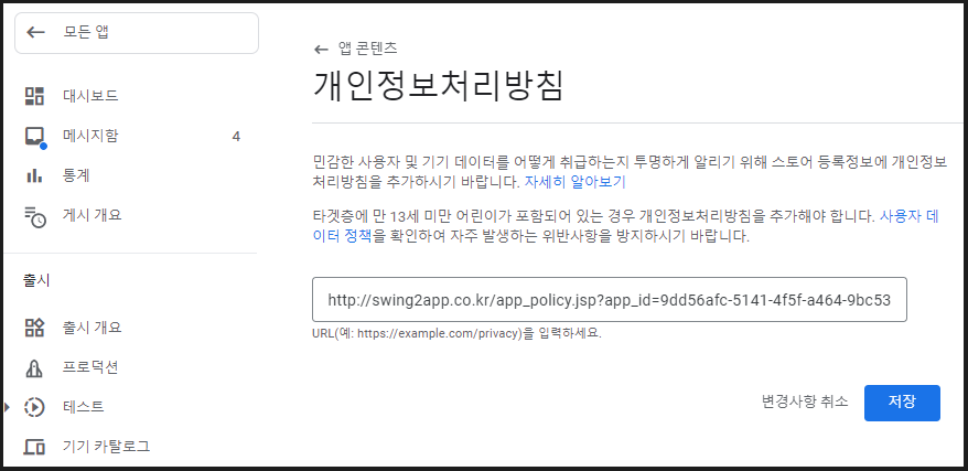 플레이스토어 앱 등록시 어디서 개인정보 처리방침 URL을 입력하나요?