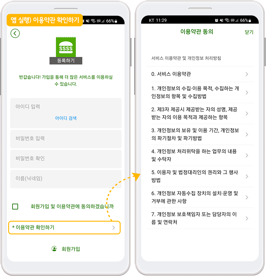 이미지 참고) 스윙투앱 앱에서 제공되는 이용약관 및 개인정보 처리방침 화면