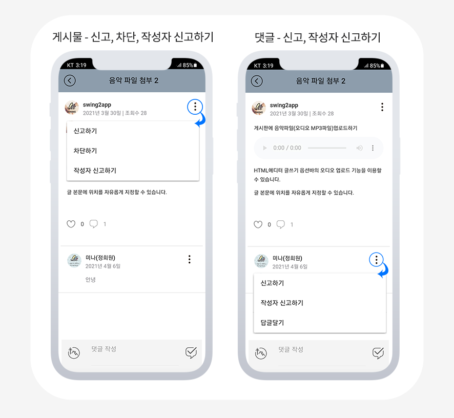 이미지 참고) 앱 게시판-게시물 신고&사용자 신고&차단 기능 제공