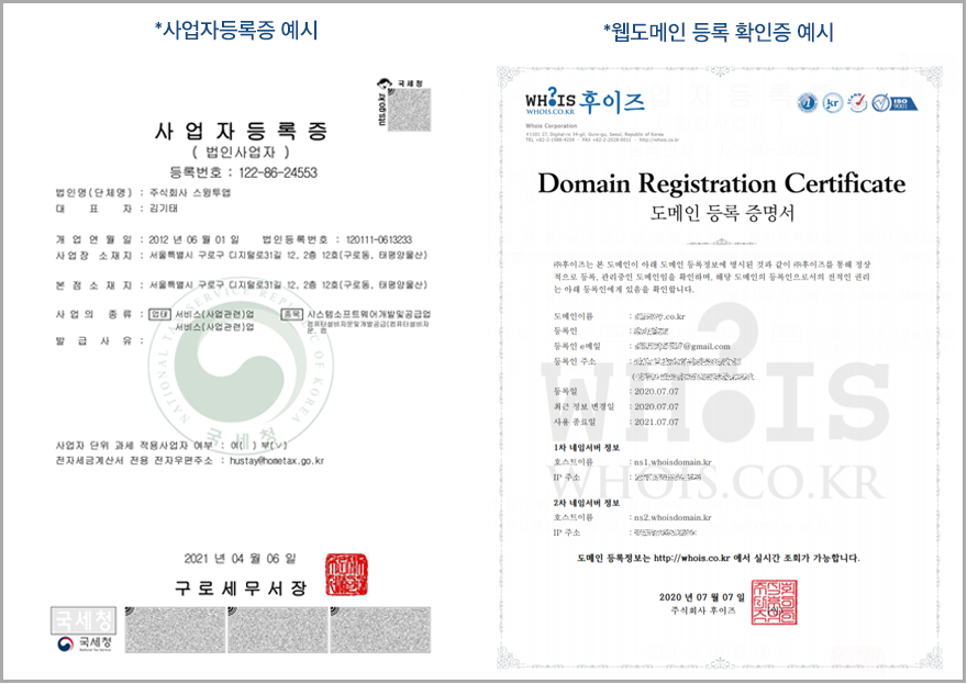 -사업자 등록증 제출 : 반드시 사업자등록증과 웹사이트에 기재된 사업주 정보와 일치해야 합니다.