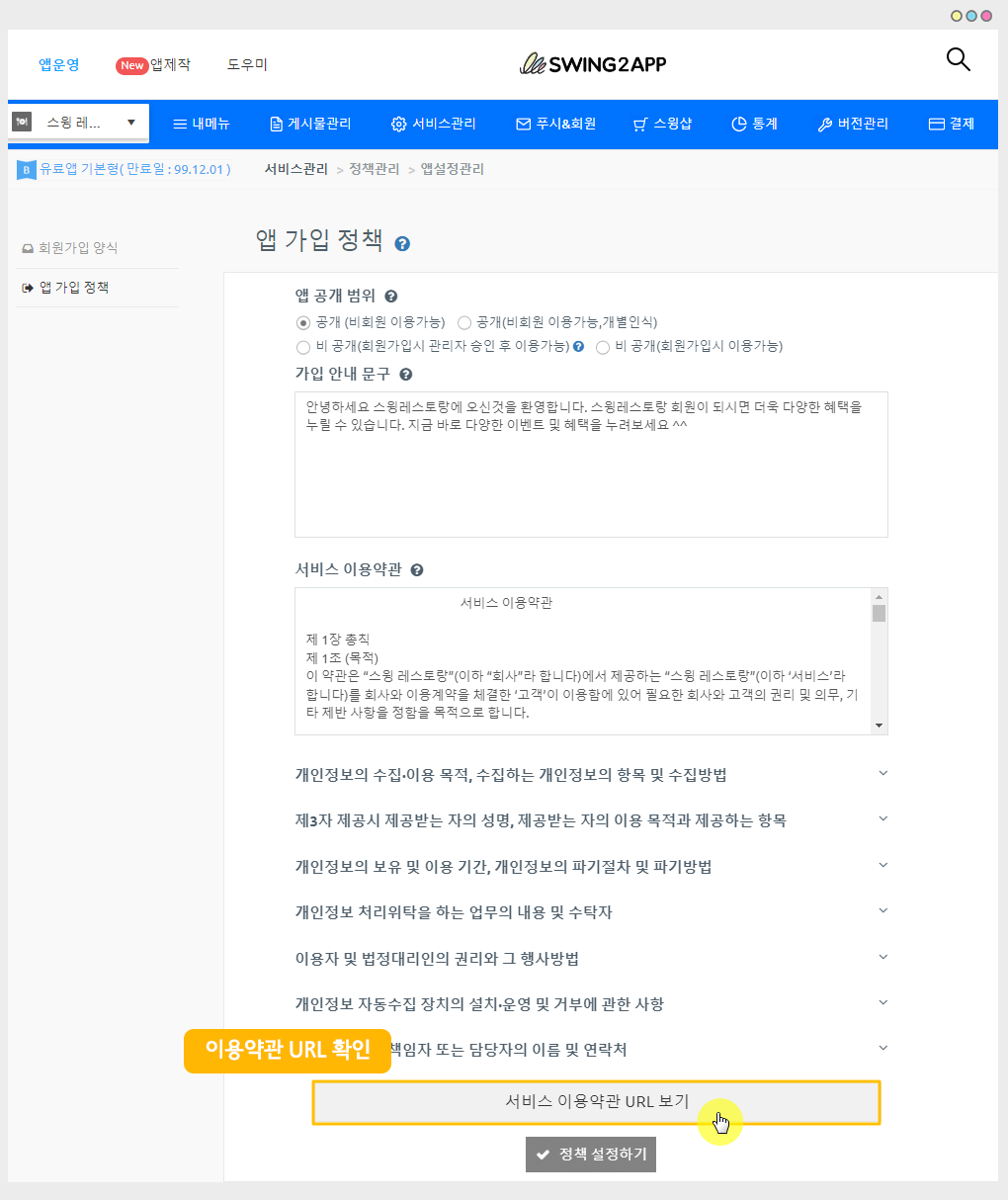 스윙투앱 일반 프로토타입으로 제작한 분들은 자체적으로 이용약관이 기본 셋팅되며, URL이 제공됩니다. 따라서 일반 앱제작 사용자분들은 스윙투앱에서 제공하는 개인정보 처리방침 URL로 제출하시면 됩니다.