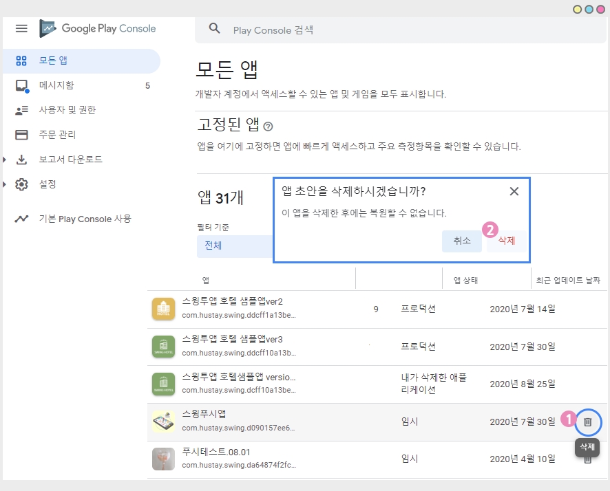 4. 앱이 [게시보류중]상태 (출시되기 전 심사를 받는 단계)라면 앱이 출시가 되기 전까지는 삭제를 할 수 없습니다.