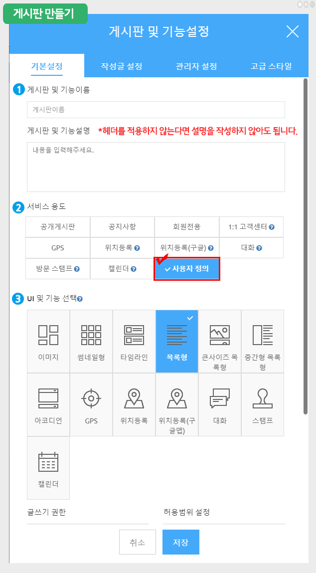 아래 상세설정 내용을 수정해야 한다면 ‘사용자정의’를 선택하시고 게시판을 설정해주세요.