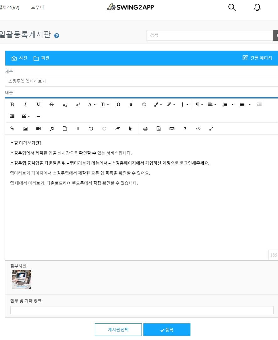 일괄등록 게시판은 일판 게시물 등록 스타일과 동일한데요.
