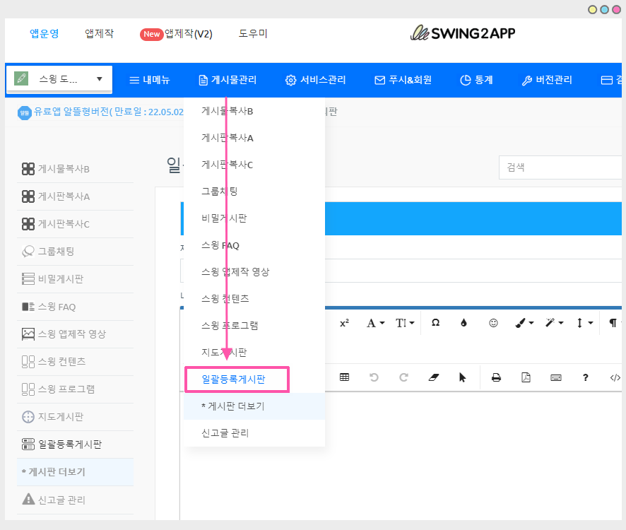 일괄등록 게시판은 스윙투앱 홈페이지 웹대시보드에서만 이용가능합니다.
