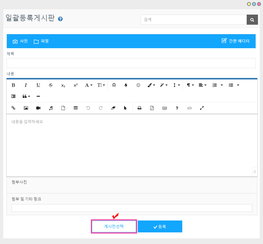 한가지 다른 점은! 게시물 등록 옆에 [게시판 선택 ] 버튼이 있다는 것입니다.