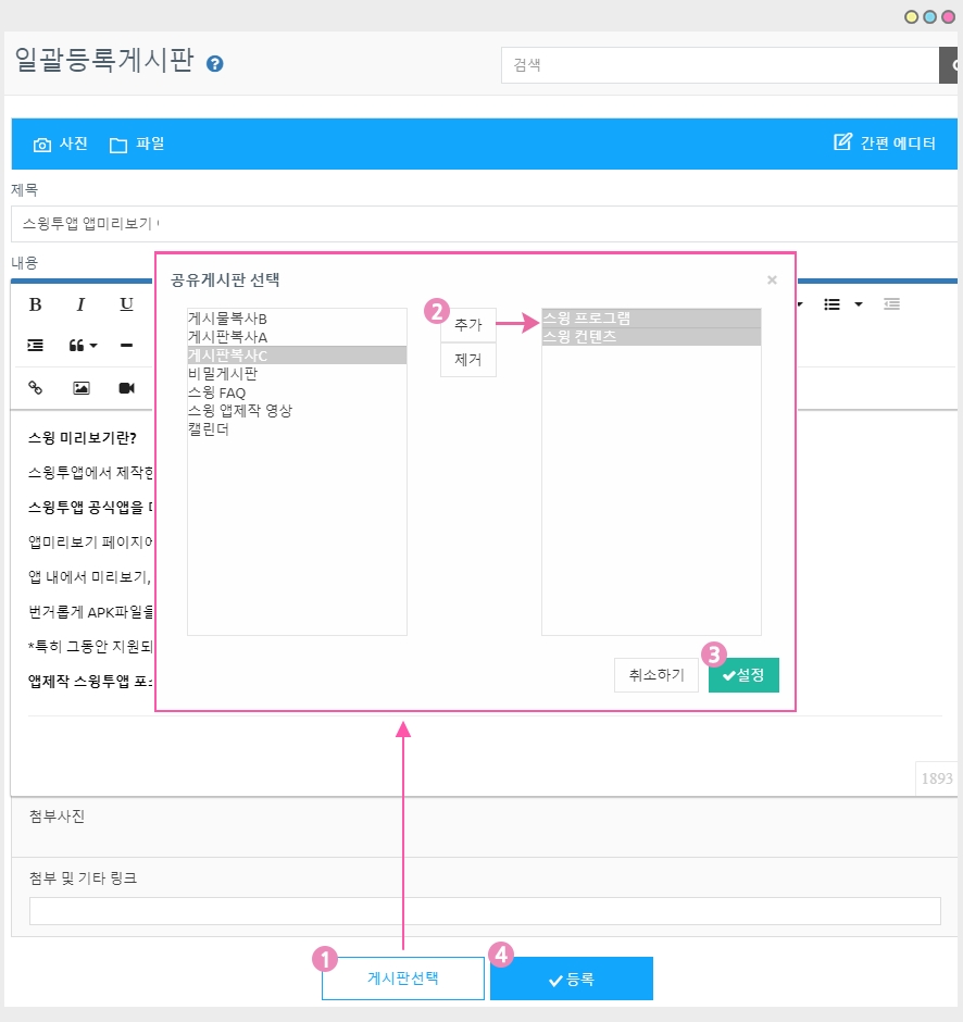 2) 공유게시판 창에서 게시물을 일괄로 등록할 게시판을 추가해주세요.