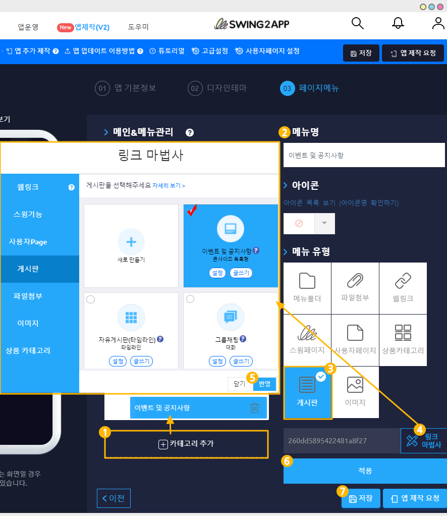 앱제작으로 이동한 뒤, 메뉴에 게시판을 적용해주세요