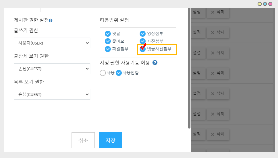 5)게시판 및 기능설정 창 상세설정에서 [댓글허용]에 체크해주세요.