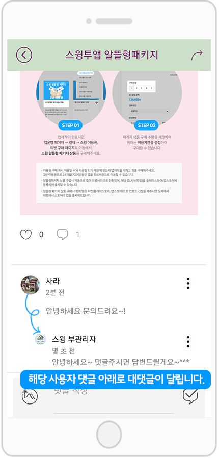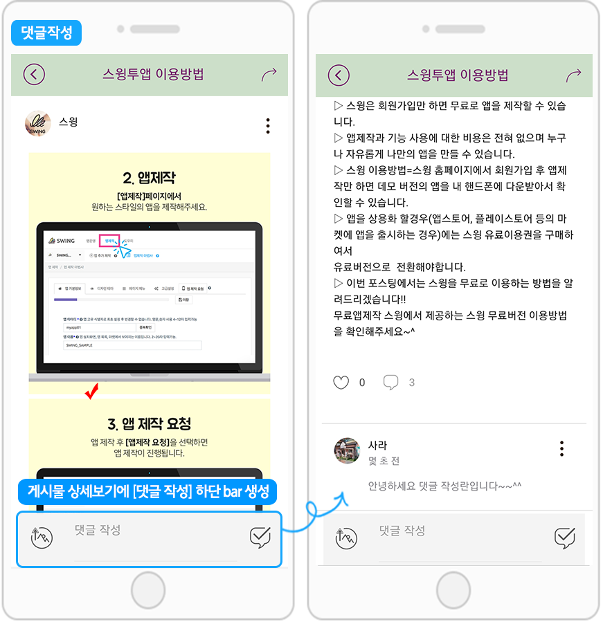 스윙투앱으로 앱제작시 게시판에서 자유롭게 댓글, 대댓글을 입력하는 커뮤니티 앱 제작이 가능하구요.