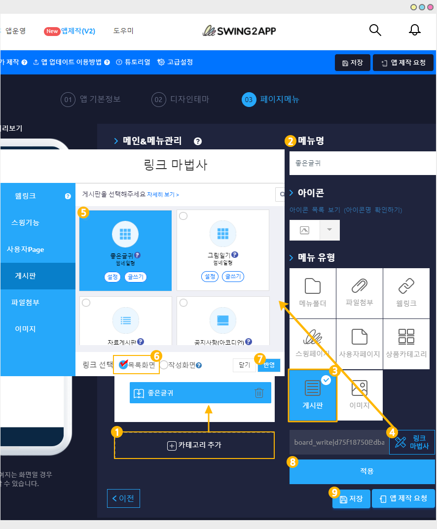 게시판은 앱제작 – STEP3페이지에서 이용가능합니다.