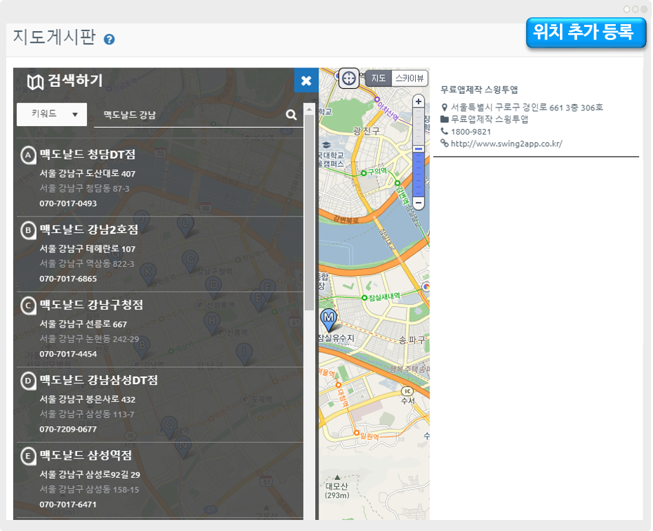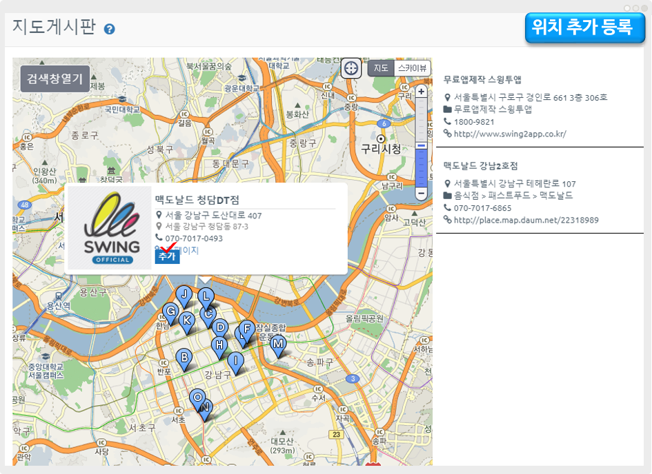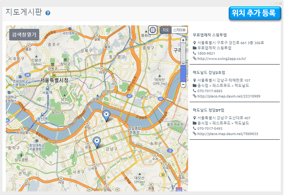 지도게시판은 여러 위치를 이용할 경우 이렇게 주소 및 키워드로 검색한 뒤 추가하여 사용하시면 됩니다.