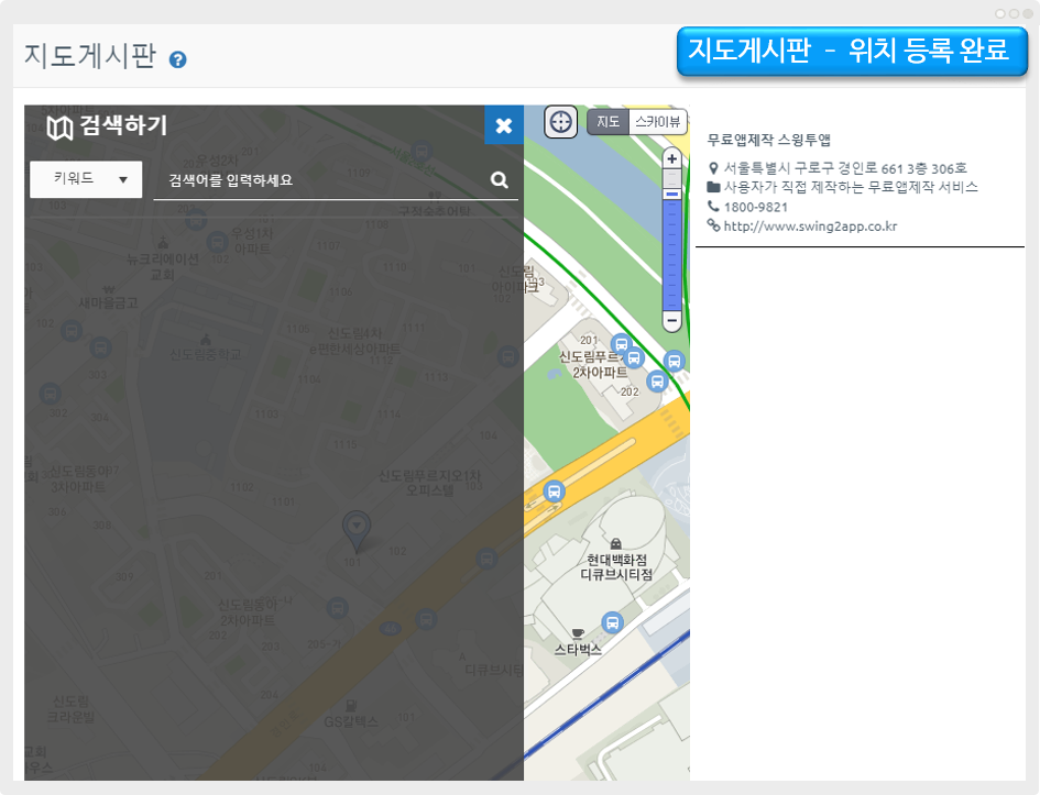 지도 게시판은 이렇게 주소 및 키워드로 위치를 추가할 수 있구요.