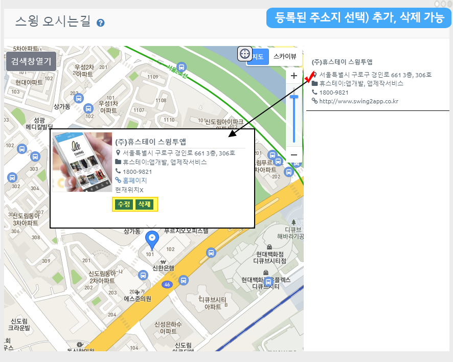 주소, 지도, 길안내 뿐만 아니라 업체의 홈페이지, 전화번호, 이미지 등록까지 할 수있기 때문에 업체홍보 활용도가 높습니다.