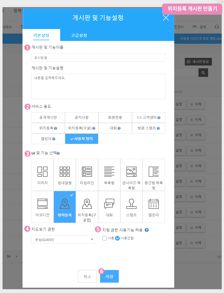 *위치등록게시판을 먼저 만들어주세요. 만들어놓은 위치등록 게시판이 없을 경우 화면에 뜨지 않으며, 앱에 적용할 수 없습니다.
