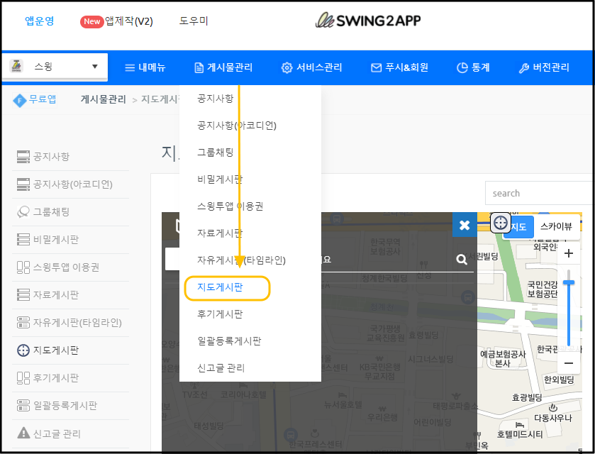 앱운영 페이지 → 게시물관리 → 만들어놓은 ‘지도게시판’으로 이동합니다.