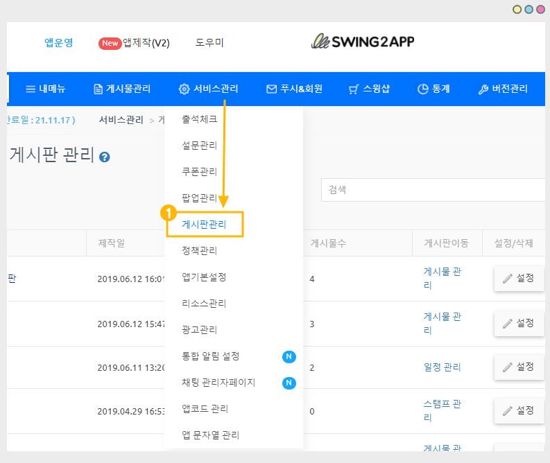 앱운영 페이지 → 서비스관리 → 게시판 관리 로 이동합니다.