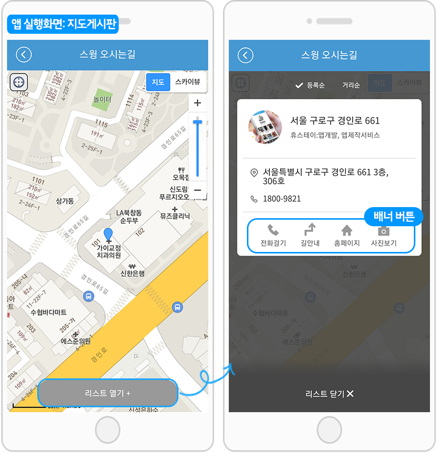 앱 실행화면을 통해서 지도게시판이 어떻게 보여지는지 확인해주시구요.