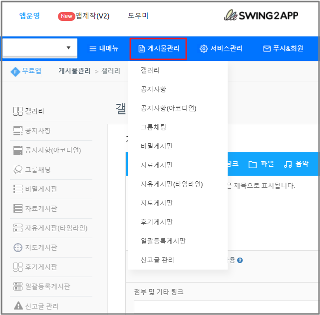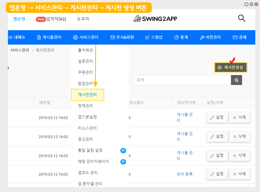 1)앱운영 페이지 → 게시물관리에서 만들어놓은 게시판으로 이동합니다.
