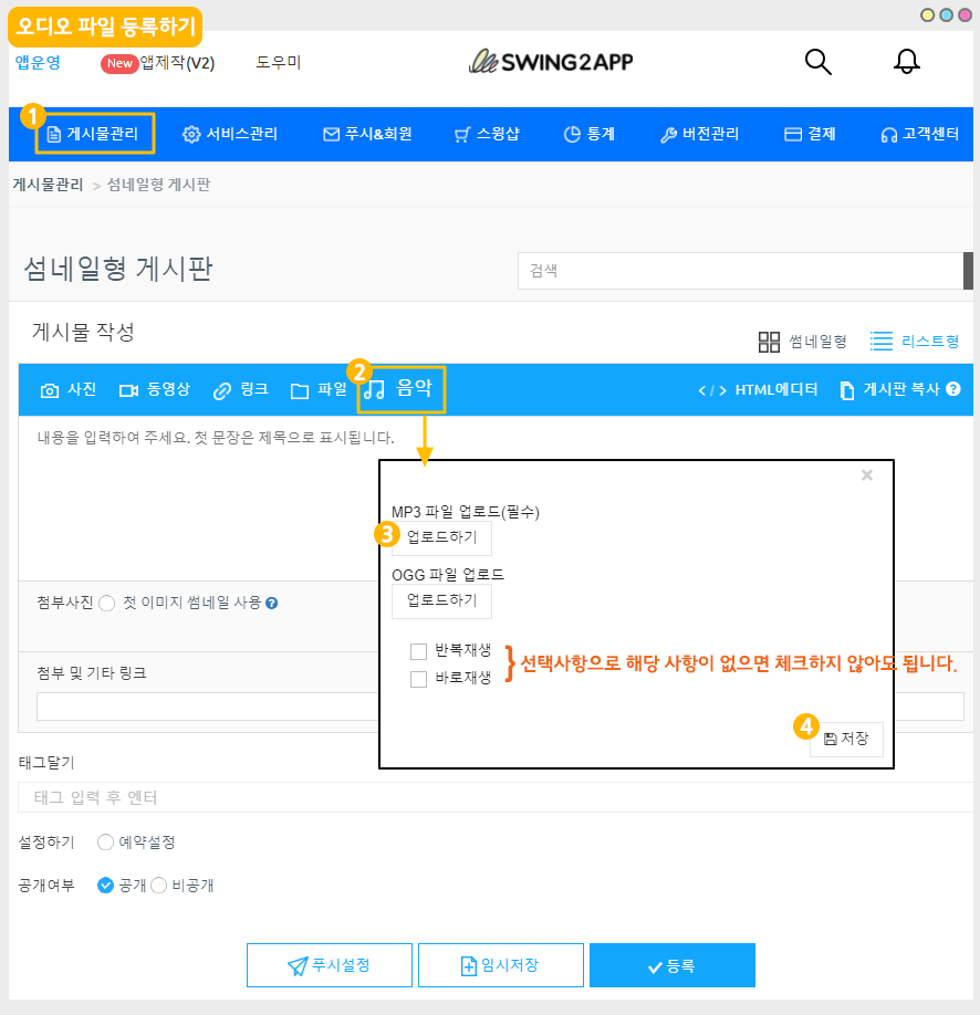 2)[MP3파일 업로드]를 선택해서 게시물에 등록할 오디오파일을 첨부해주세요.