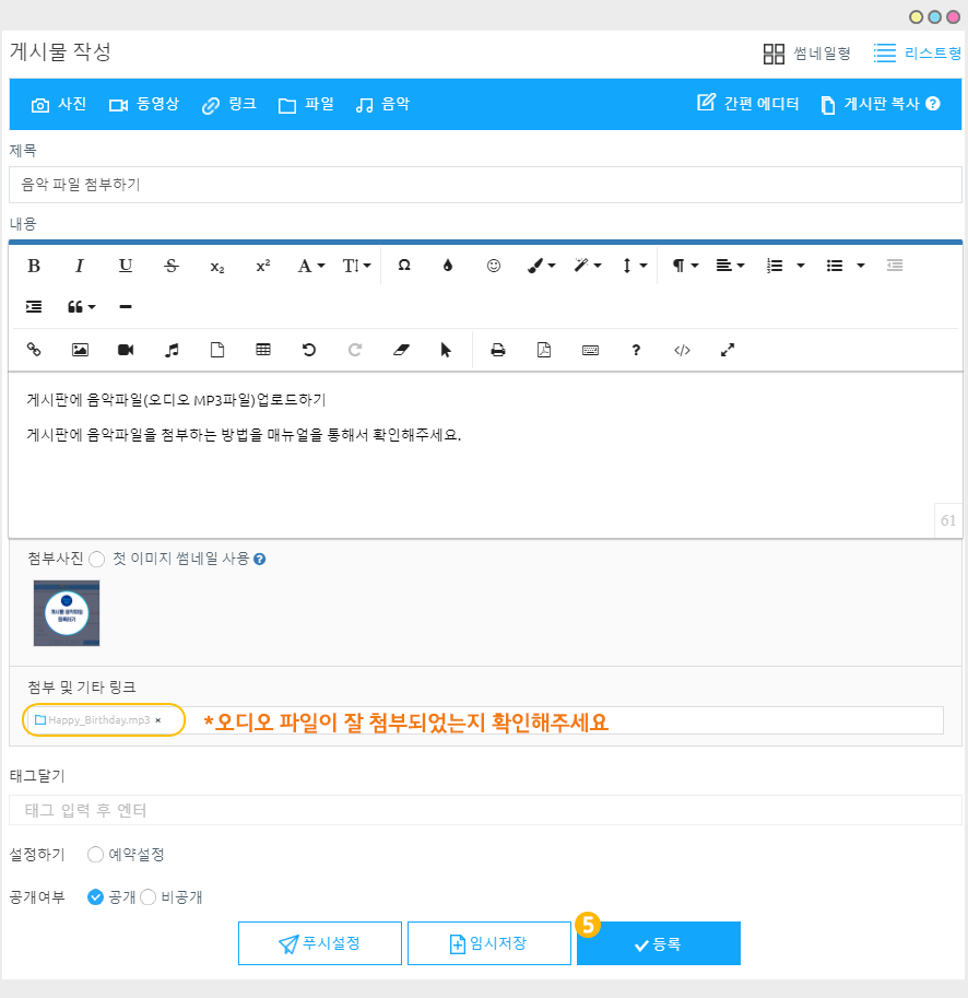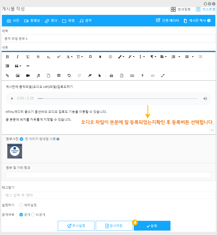 4)본문에 오디오가 잘 업로드 되었는지 확인 후 [등록]버튼을 선택해주세요.