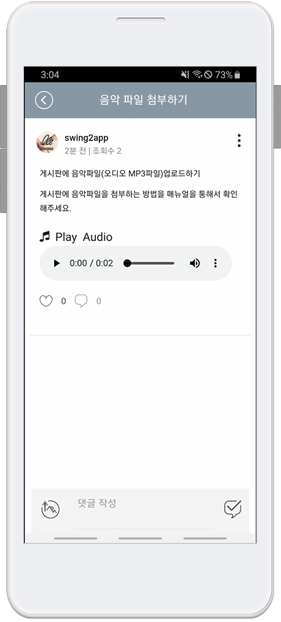게시물 상세보기로 들어가면 첨부해놓은 오디오파일의 재생 bar가 생성이 되구요.