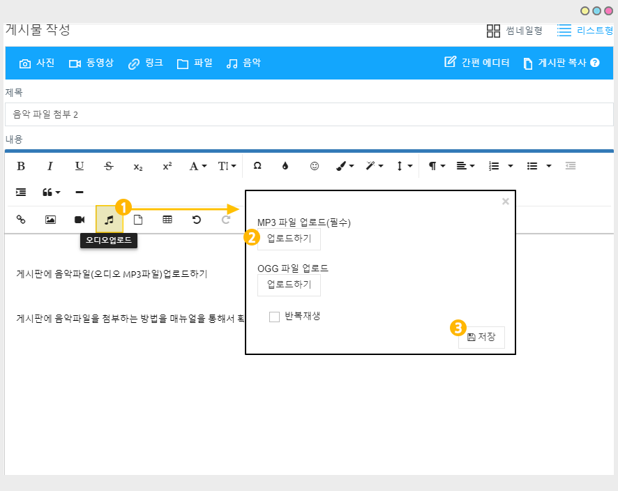 오디오 파일첨부 첫번째 방법은 게시판에 제공되는 기능 중 [음악]버튼을 이용하여, 게시물에 첨부를 하는 방법입니다.