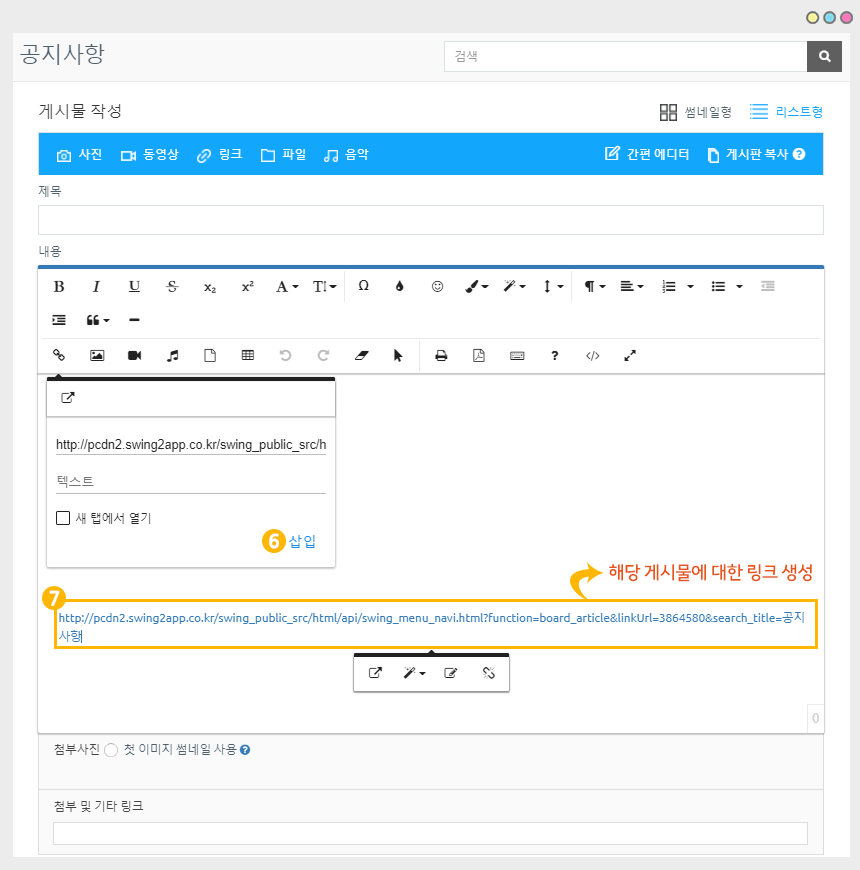 7)게시물 작성 화면에 해당 게시물에 대한 링크가 생성된 것을 확인할 수 있습니다.