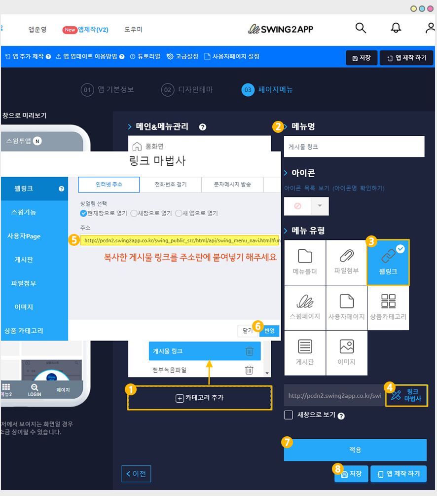 5. 웹링크 주소란에 앞에서 복사한 게시물 링크를 붙여넣기 해주세요