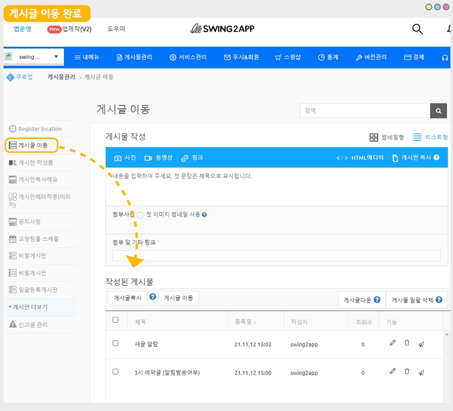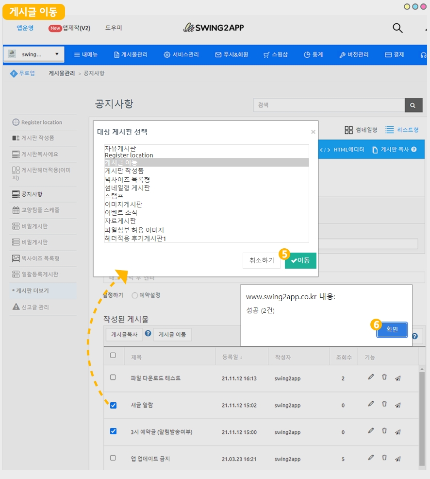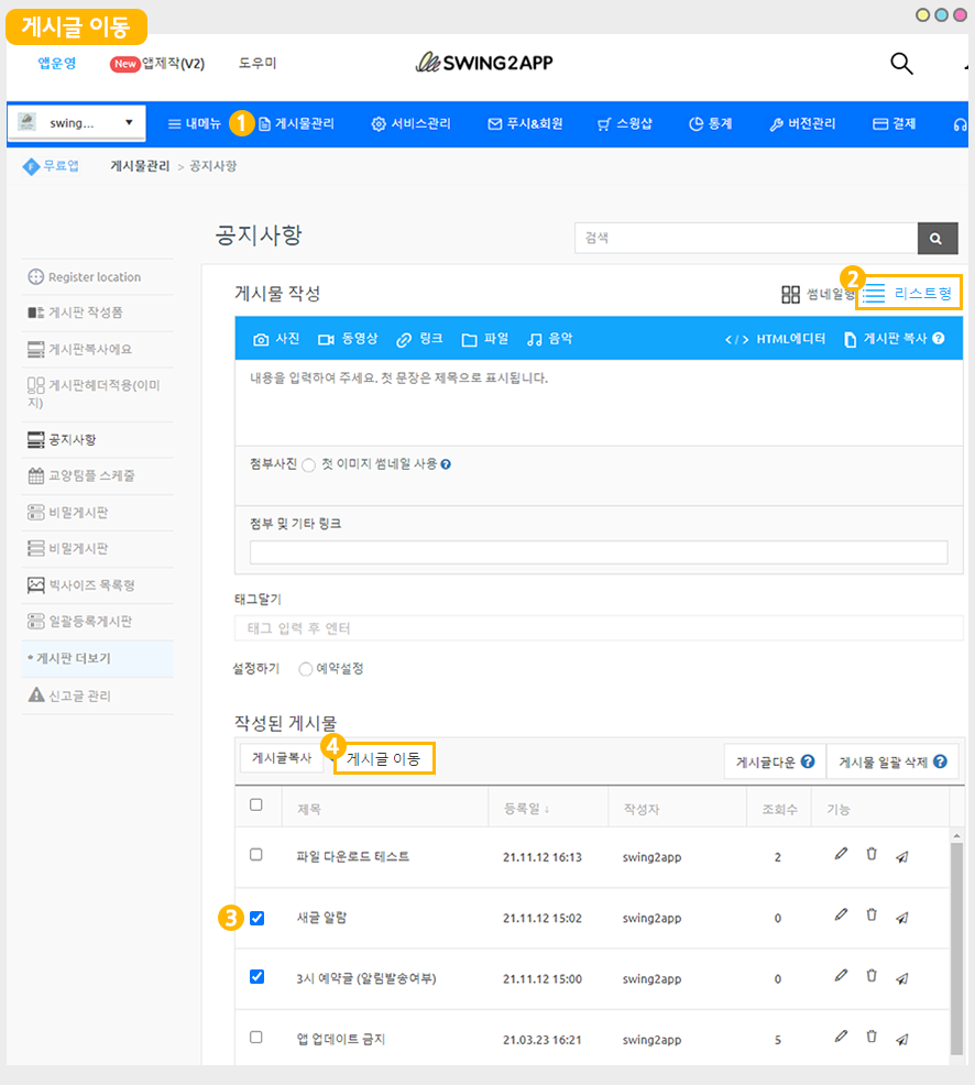 1)앱운영 – 게시물 관리에서 만들어놓은 게시판을 선택해서 이동합니다. (게시글을 이동하고자 하는 게시판 선택)