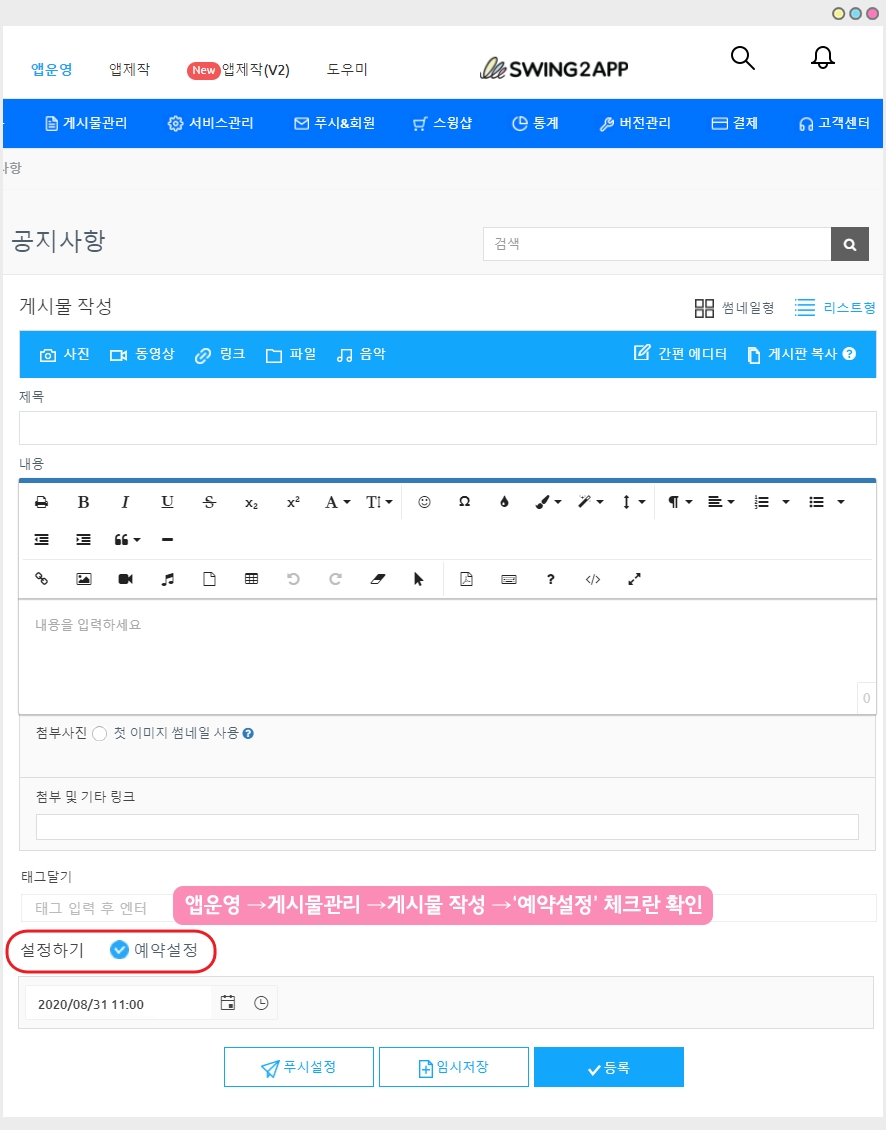 4. 예약설정 기능은 웹 대시보드- 게시물 관리에서만 이용 가능합니다.